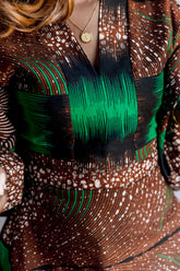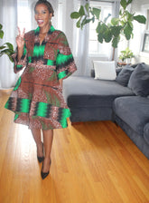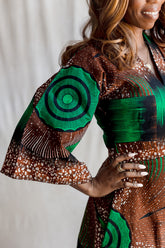 This chic allure dress, adorned with a captivating African print in earthy brown and vibrant green hues. This dress effortlessly merges elegance and sensuality, featuring a silhouette that accentuates your body. The intricate detailing and bold patterns make it a perfect choice for those who seek both style and allure in their wardrobe.