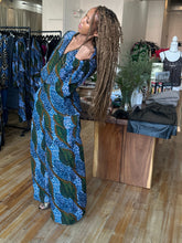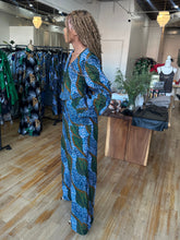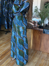 A versatile two-piece set designed for comfort, movement, and everyday wear. Made with high-quality African wax print in blue and green tones, this set features a relaxed V-neck top and wide-leg pants for an easy, flattering fit.