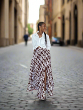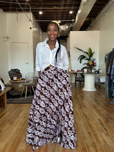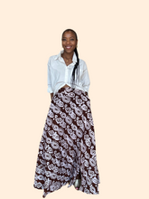 Flow with effortless grace in the Zawadi Maxi Skirt, a bold statement piece made from hand-dyed Tanzanian batiki fabric. The rich brown and white geometric print adds depth and drama, while the flowing silhouette brings comfort and confidence with every step. Whether styled casually with a crisp shirt or dressed up for a special moment, this skirt is pure wearable art.