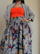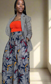 Elevate your wardrobe with the Asili front button full skirt. The soft grey base is brought to life with bold red, deep navy, and golden-yellow leaf motifs, creating a perfect balance of subtlety and statement. With a full, flowy silhouette and side pockets for modern practicality, this skirt transitions seamlessly from workdays to weekend outings. Pair it with a tailored blazer for boardroom polish or a bandeau top for a relaxed, fashion-forward vibe.