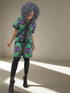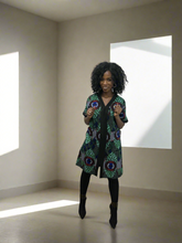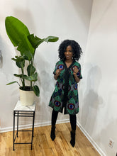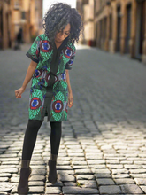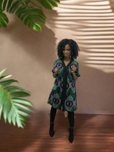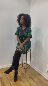 This chic African print sheath dress features a striking green and black pattern, designed to fall gracefully above the knee. Its tailored silhouette highlights the waist, while functional, visible pockets add a stylish yet practical touch. Perfect for casual or semi-formal occasions, this dress effortlessly blends modern elegance with a bold cultural aesthetic.