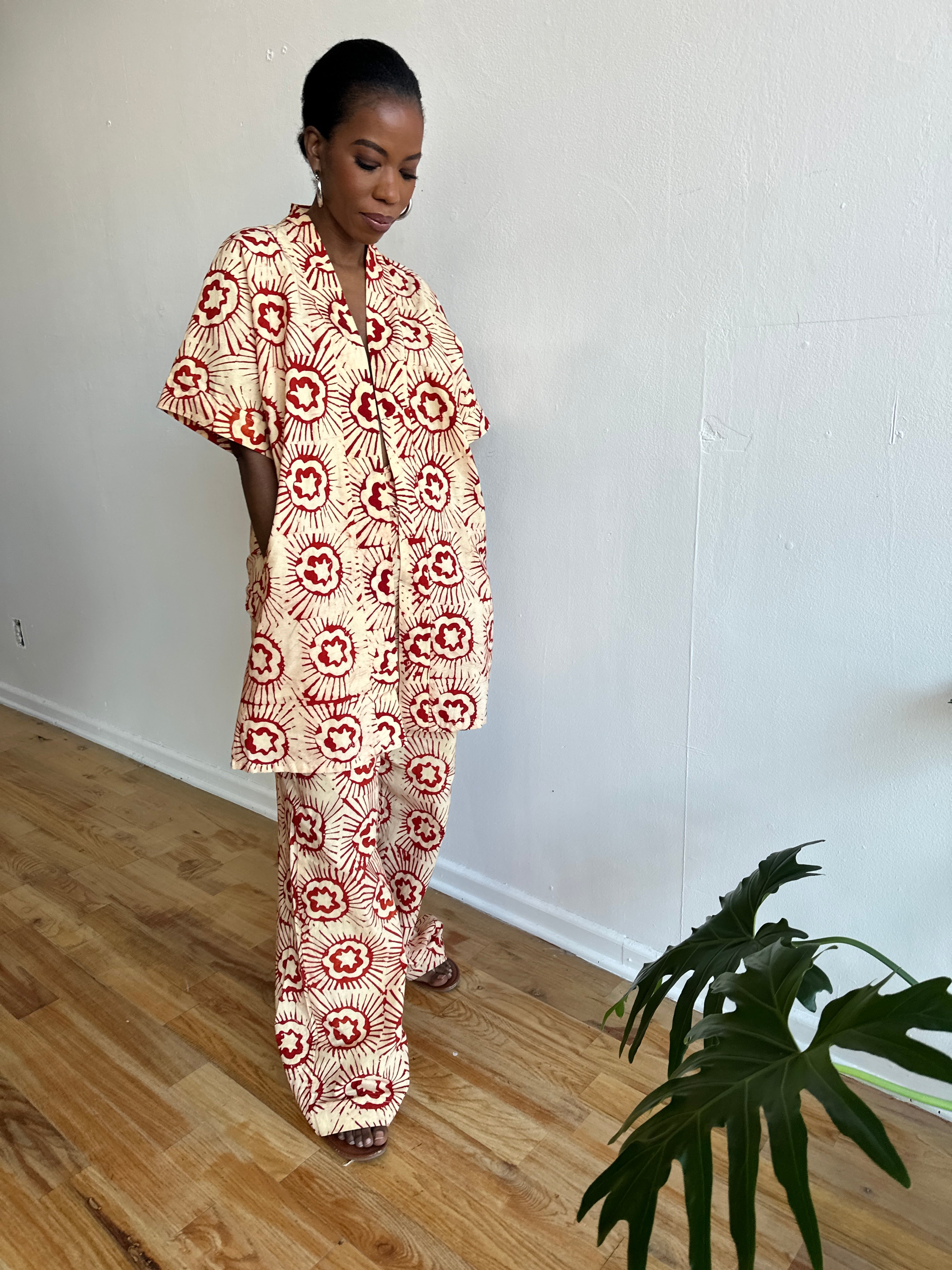 Each set is one-of-a-kind, showcasing vibrant, handcrafted batik prints that celebrate artistry and culture. Thoughtfully designed with functional pockets and a flattering loose fit, The Raha Set brings both purpose and personality to your wardrobe.